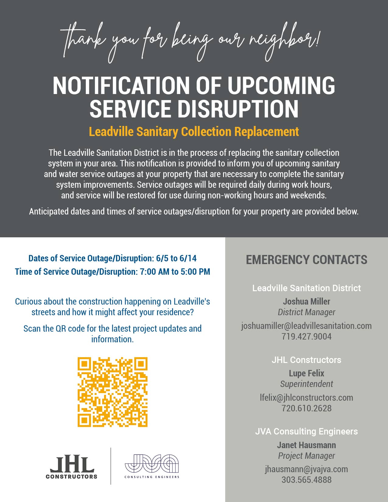 The Leadville Sanitation District has contracted JVA Consulting Engineers and JHL Constructors for replacement of the sanitary sewer system throughout select areas in the City of Leadville. Work will be completed in two phases. Phase 1 work is complete and Phase 2 work will be completed May through September of 2025.