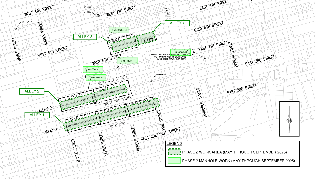 Work will generally include pavement sawcutting and removal; removal of the existing sanitary main and access manholes; installation of new sanitary main, service connection tie-ins to the new main, and new access manholes; and restoration of asphalt pavement, concrete surfaces, and alley areas.